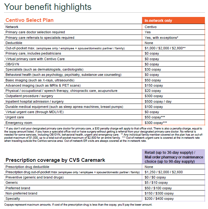 Need more information to help decide if the Centivo Select Plan is right for you? We’ve got you covered. Click the image for a high-level benefits chart, or click below for plan highlights or a full summary of benefits and coverage.